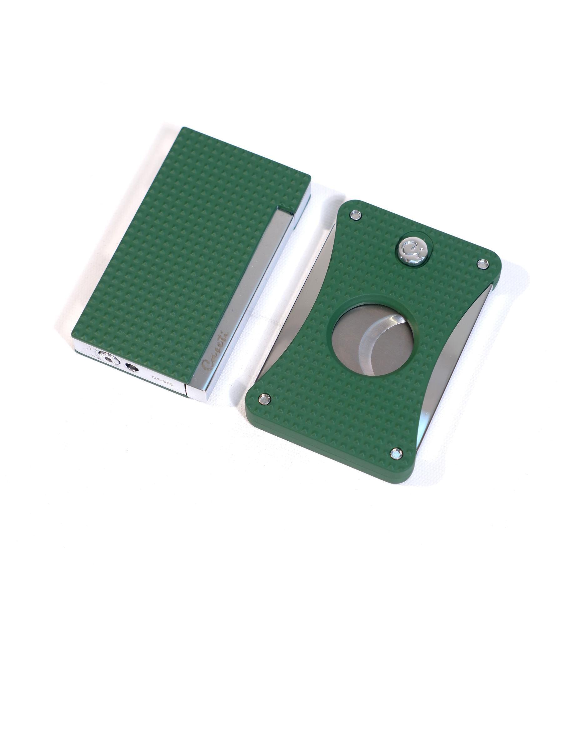 Caseti Yeşil 3D Tasarımlı Premium Puro Seti CAT003, şık tasarımı ve kaliteli içeriği ile puro keyfini tamamlayan özel bir settir, çakmak ve kesici gibi temel aksesuarları bir arada sunarak pratik kullanım sağlar, kompakt ve estetik yapısı ile hem günlük kullanım hem de hediye için ideal bir tercihtir.